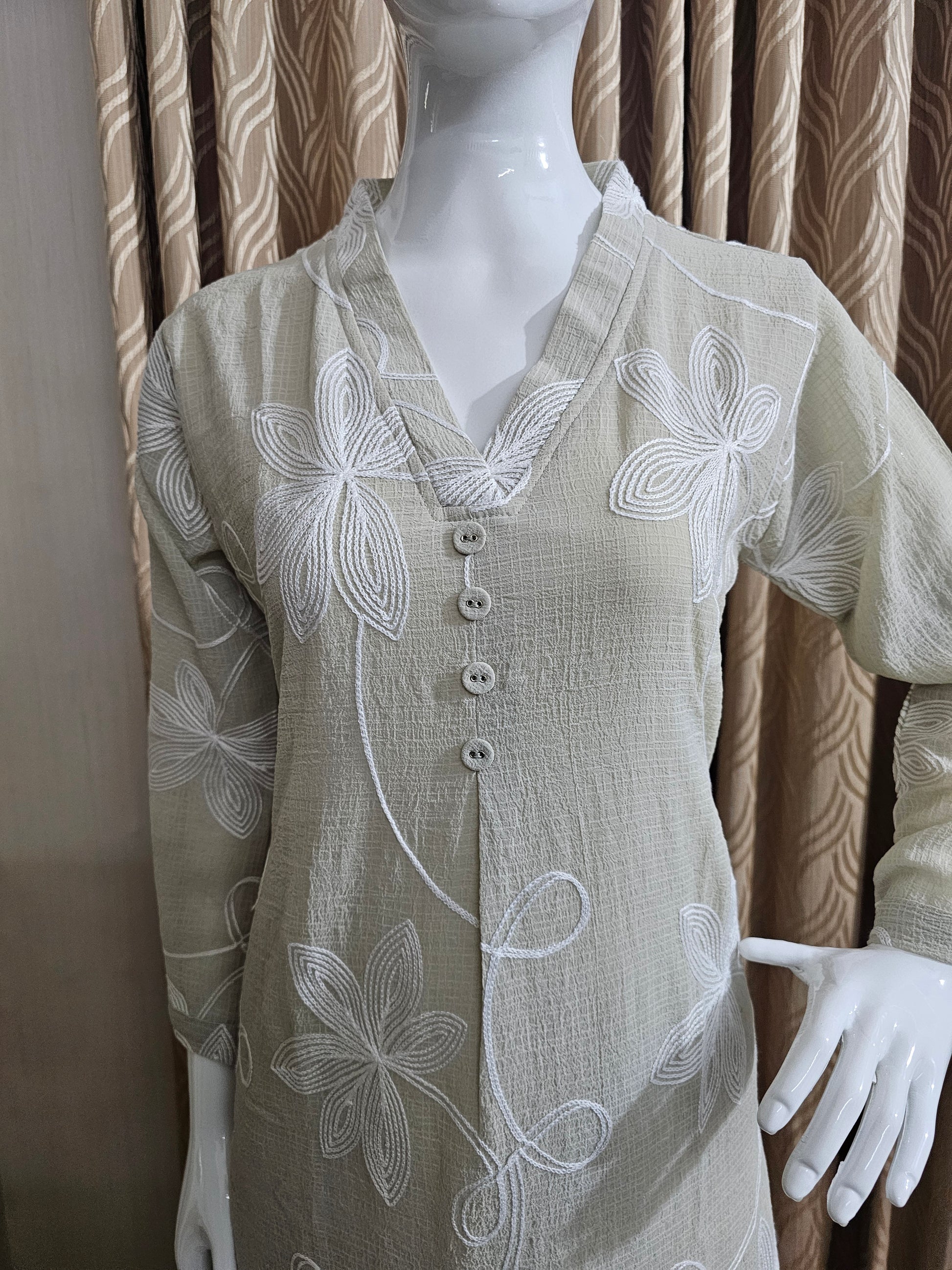A graceful pastel beige co-ord set with delicate white thread embroidery. The floral handwork and buttoned neckline add a touch of elegance, making it perfect for casual outings or subtle festive looks. Light, breezy, and effortlessly stylish