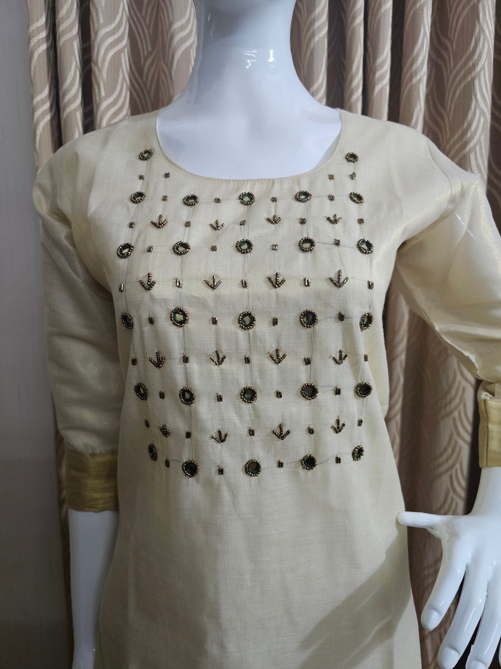 Ivory tissue kurti is crafted from a cotton-silk blend, offering a subtle sheen and a refined look. It features intricate mirror work and thread embroidery in a neat grid pattern on the front yoke, adding a touch of festive sparkle. The design is complemented by three-quarter sleeves and golden borders on the cuffs and hemline. The straight-cut silhouette pairs beautifully with matching bottoms, making it ideal for festive gatherings and traditional occasions.