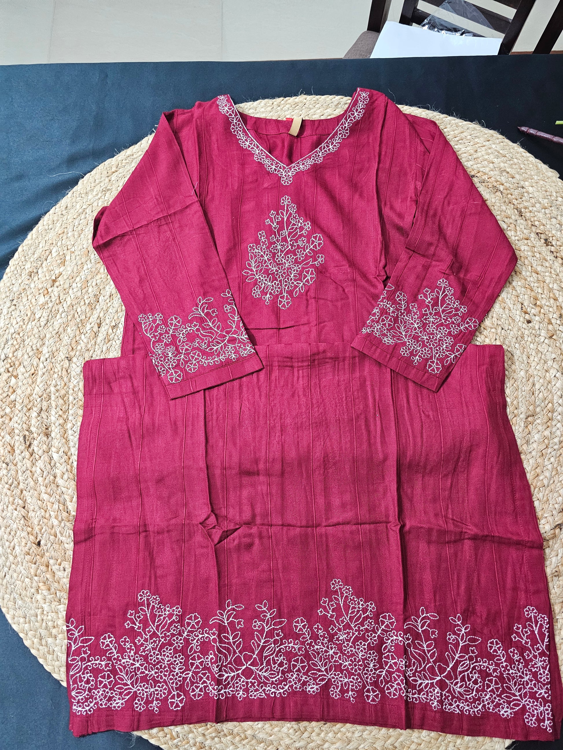 Ethnic beautifull kurti in a rich maroon and black. Crafted with care.Delicate white floral embroidery enhances the neckline, sleeves, hemline, and center front, adding a graceful feminine charm.