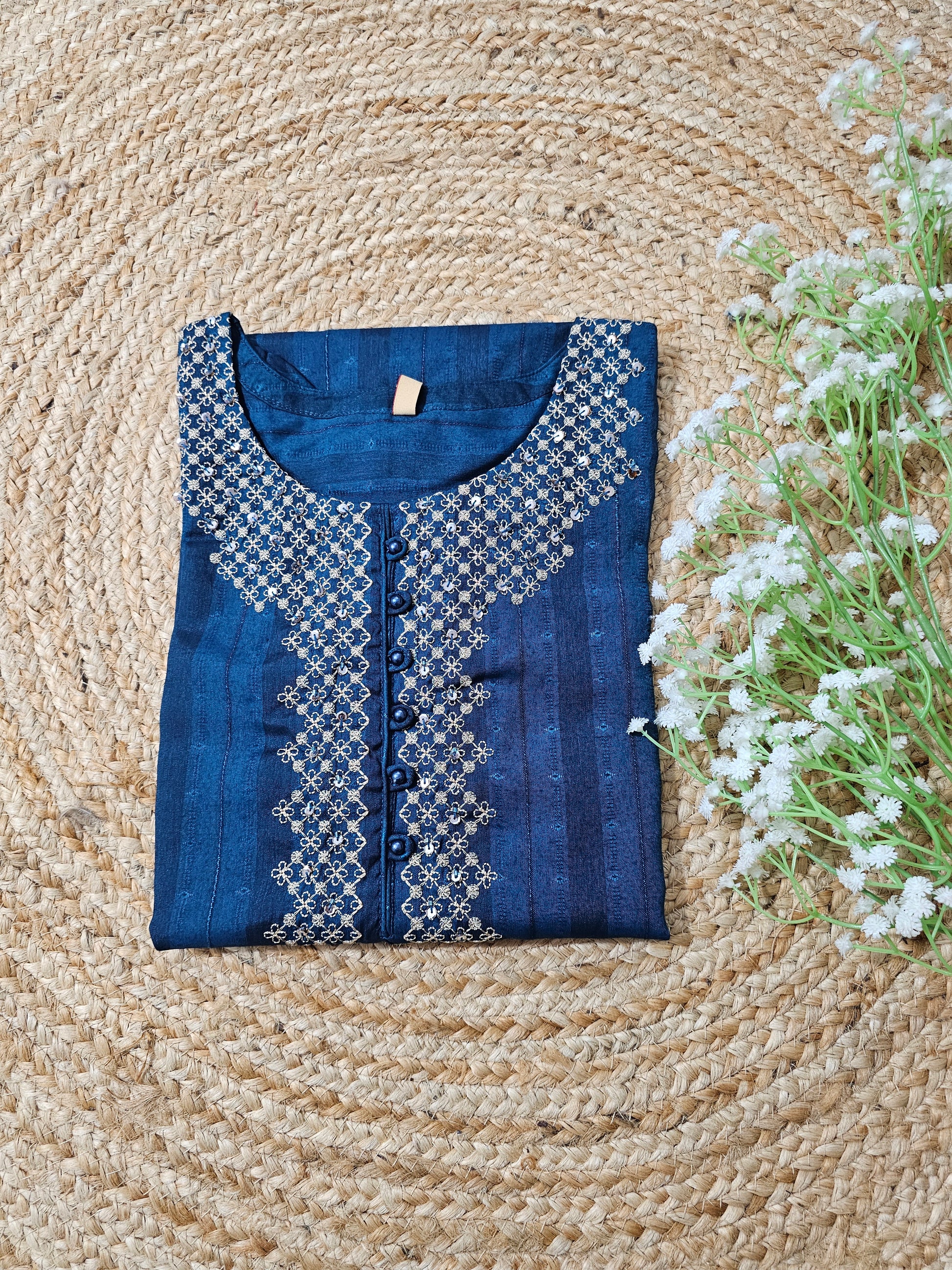 Step into timeless elegance with this beautifully crafted navy blue kurti. Designed with subtle vertical weave patterns, it features intricate white floral thread embroidery around the neckline and front placket, adding a delicate and traditional touch. The fabric buttons enhance its ethnic charm, while the cuffed sleeves with fine thread detailing bring a refined finish.