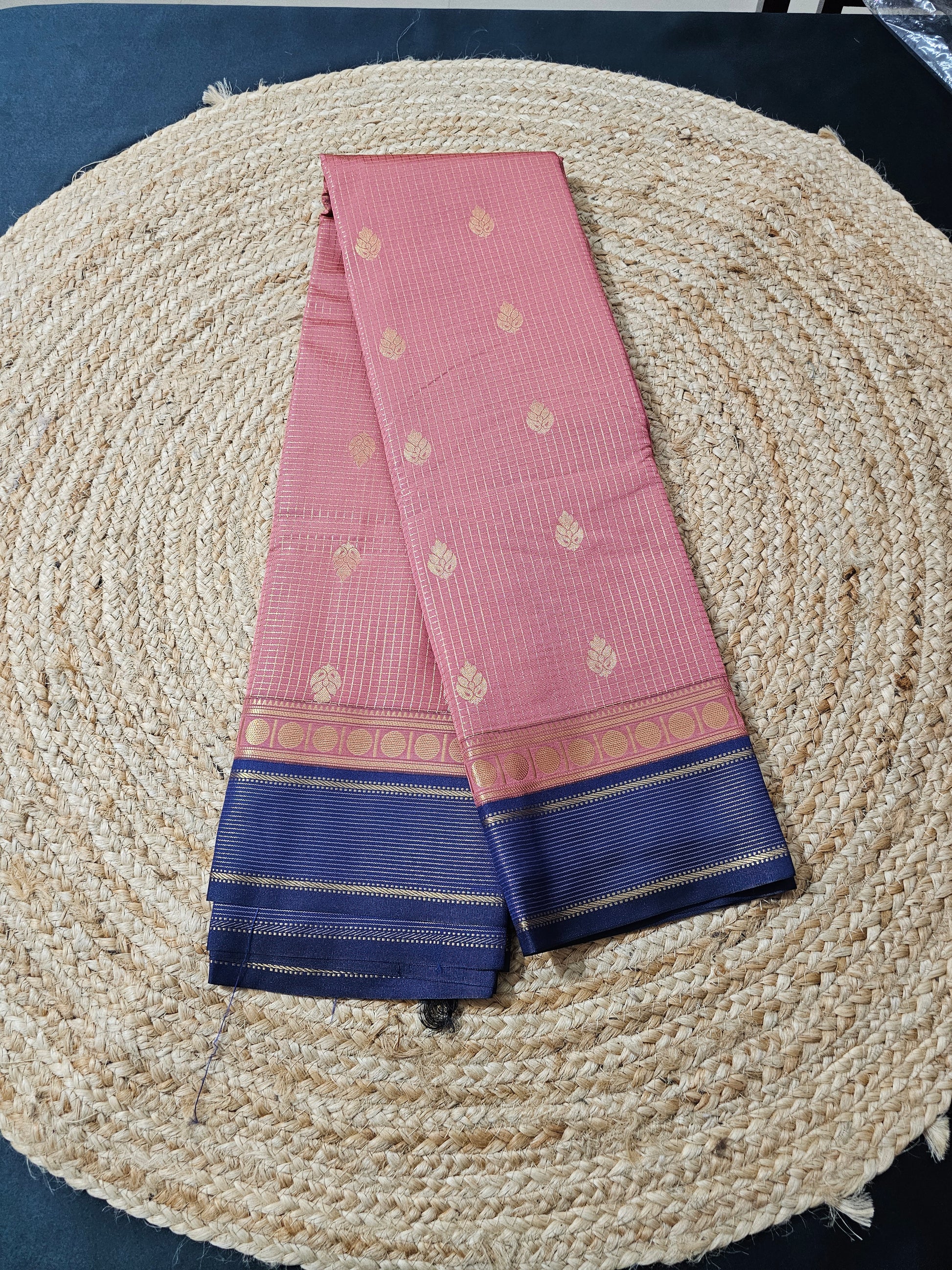 Gracefully traditional, this stunning silk saree features a charming blend of soft pink and rich navy blue. The pink body is adorned with delicate golden zari motifs and fine grid weaving, offering a subtle yet luxurious shimmer.